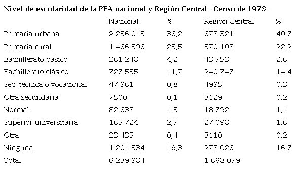 Estas cifras fueron motivo de preocupación para los entes gubernamentales, particularmente por el enfoque economicista con el que se concibió la educación y que, de alguna manera, se consignó en el Boletín mensual de estadística (1977): "el nivel educacional de la PEA tiene una función primordial en el desarrollo económico del país ya que la mayor o menor productividad de los factores de producción está asociada al nivel de capacitación de los recursos humanos" (p. 10).
