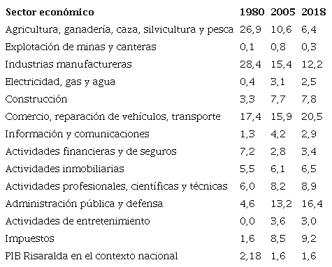 También, en este mismo periodo de 38 años, comprendido entre 1980 y 2018, la industria manufacturera mostró una caída importante en la participación en el PIB departamental, pues pasó del 28,4 % al 12,2 %. Esto obedece en parte a que, de las 25 515 empresas medias y grandes de la industria manufacturera en Colombia, solo 50 están en Risaralda y el 64 % de estas últimas son de bajo nivel tecnológico (Tamayo et al., 2017), lo que puede significar poca contratación de mano de obra de alto nivel académico.