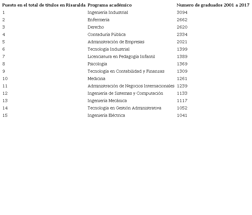 A pesar de estas cifras de desempleo y de salarios no satisfactorios, la expansión de la educación superior y de la graduación21 en el país ha sido creciente. Este comportamiento incluye a Risaralda, que cuenta con un número importante de profesionales graduados. Según cifras del SNIES (2018), entre el primer semestre del 2001 y el segundo semestre de 2017, se registró el otorgamiento en Risaralda de 76 563 títulos, de los cuales 62 672 eran de pregrado y 13 891 de posgrado. Estos títulos cubren una amplia gama de profesiones. Entre ellas se destacan, principalmente, ingenieros industriales, enfermeras, abogados y contadores públicos. En la tabla 8 se muestran las quince profesiones con más títulos otorgados en educación superior en Risaralda entre 2001 y 2017.