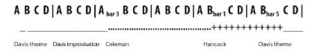 The soloists (Davis, Coleman, Hancock) move independently within the standard-they don't necessarily follow the 32-bar chorus scheme. The extension of the improvisations depends only on the musicians' taste. Table 5 shows the independence of the extension of the improvisations from the song's basic structure. Miles' re-exposition of the theme from the fifth measure of the B section (11:24) is remarkable. This unconventional aesthetic choice further contributes to the disintegration of the song and its reassembly in a new form. Table 5 shows how the standard 32-bar structure finally comes out. It is important to consider the musical form not as a mechanical calculation of measures; otherwise we will misunderstand one of the interesting aspects of the Philharmonic Hall concert. The form is evidently only a scheme on which the musicians build a musical continuum that isn't limited to the structure of a single 32-bar chorus. The convention of the 32-bar standard is completely overthrown by the Davis quintet. They pay attention to a new overarching form that takes into account the evolution of the piece from the beginning until the final notes. What is important is not the unity of each individual chorus but that all the improvisations contribute to a coherent musical whole. The mood of Davis' improvisations is worked out by the other musicians-especially by Coleman, who connects his solos to the last notes of Davis' last phrase. The coherence of the new overarching form is highlighted by the internal contrasts and the segmentation of the structure. (Bragalini, 1997, p. 54)