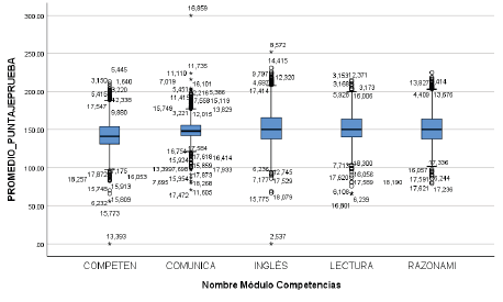 Cuando se analiza esto en los resultados por componente de la prueba (figura 2), se evidencia que los puntajes son superiores para las IES y programas acreditados -valores por encima de las cajas-, lo que comprueba de manera estadísticamente significativa que existen diferencias entre los desempeños en las pruebas censales y relaciones entre los resultados de las pruebas y el estatus de la IES o programa. Sin embargo, esto no certifica que dicha asociación se deba a un efecto del SACES, sino que puede deberse más a una condición recíproca entre calidad de la IES o programa y resultados, o viceversa.