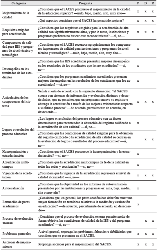 De esta manera, se estructura el cuestionario de sondeo con base en unas categorías y preguntas derivadas del análisis documental (tabla 1), las cuales deben ser contestadas por cada sujeto, según su perfil (P, D o R), con la intención de que sirvan para detectar los principales problemas que se presentan en el SACES y de sentar las bases de la propuesta de mejoramiento.