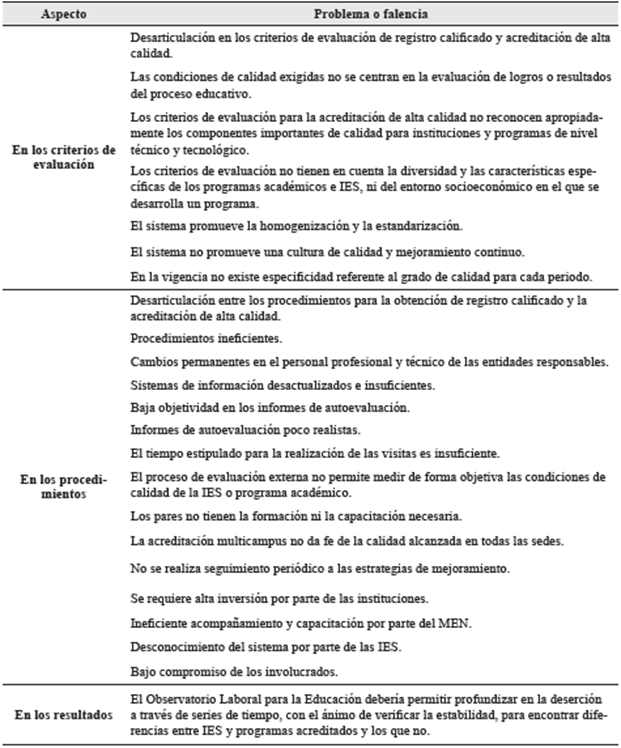 Si bien el SACES en Colombia surge con la intención de vigilar y corroborar que las IES y sus programas cumplan los estándares de calidad, como se ha podido constatar, existen algunas falencias, las cuales han sido señaladas por los análisis realizados y la comunidad académica encuestada.