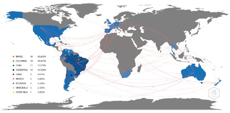 Although the criterion for inclusion of the texts was authorship by researchers belonging to Latin American institutions, given the international collaboration of the studies, the statistics show authorship from, for example, the United States, Australia, Germany, and Spain (figure 2).