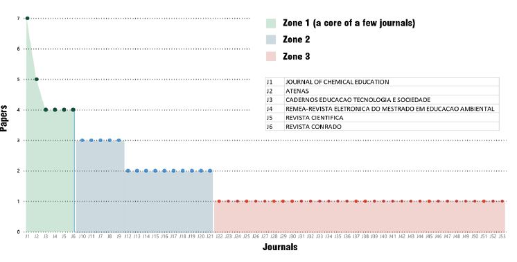 Bradford's law indicates that if the elements of a set of journals are ordered in a decreasing order, in relation to the number of articles on an object under study, it is possible to show the core of journals dedicated to the subject of study, i. e., there is an unequal distribution in which approximately 20% of the journals produce 80% of the documentary corpus (Urbizagástegui, 1996). Figure 3 shows the production zones. It should be noted that the journals consolidated as a production nucleus can be a reference for the state of the art on natural sciences curriculum.
