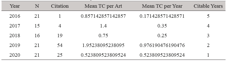 Regarding the citation of documents as a quantitative element of research impact, a total of 103 citations are found (table 1), with a maximum of citation in 2019 (54). Citations are concentrated in a total of 42 articles. The research project by Hurst et al. (2019) is the most cited (14). It is worth mentioning that the author team belongs to institutions in the United Kingdom, the Netherlands, Spain, South Africa, Argentina, and Mexico. That article presents the results of the study of perspectives and trends on chemical education with a sustainable approach with emphasis on systems thinking.