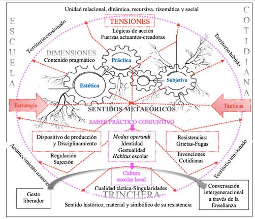 Proponemos comprender la experiencial escolar como una categoría conceptual y metodológica, la cual es preciso abordar desde tres adjetivaciones: multidimensional, conjuntiva y tensional; la primera alude a las dimensiones estética, práctica y subjetiva que la configuran; la segunda al saber práctico compartido que constituye una cultura escolar local y la tercera a las tensiones en medio de las cuales emergen los sentidos metafóricos que hacen posible la escuela en tanto invención cotidiana. A continuación profundizamos cómo se relacionan estos conceptos en el entramado experiencial: