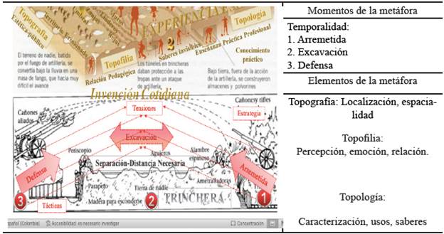 Como se observa en la Figura 10, las trincheras se crean en un contexto bélico en respuesta a la necesidad de supervivencia ante los ataques del enemigo; de esta manera, sirven como figura para representar la confrontación de posiciones detractoras y defensoras que hacen de la escuela un territorio en permanente disputa. La temporalidad de su funcionamiento opera mediante tres momentos: arremetida, excavación y defensa, y su andamiaje se organiza por los elementos que, de acuerdo a las ampliaciones de Lakoff y Johnson (2005) acerca de las metáforas de la vida cotidiana, caracterizan la topografía, topofilia y topología de su cotidianidad.