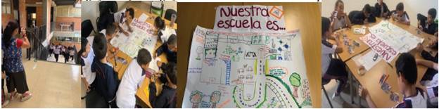 A esta gestualidad subyacen funciones normativas y repertorios de valoración colectivos y simbólicos que conforman el universo visible y perceptible de una estética sui generis, la cual nombramos en este estudio como la estética de lo público, que de acuerdo con Rancière (2004) y Mandoki (2006) la entendemos como una experiencia de inmersión cotidiana, configurada a partir del reparto de lo sensible y del encuentro con las matrices estéticas que hacen distintiva la urdimbre de las escuelas públicas; en la cartografía de la Figura 2, estos estudiantes grafican y relatan a partir de fotografías dichas matrices cuando hacen alusión a los saberes escolares que les enseñan, los espacios que se disponen y transitan en la arquitectura de su escuela, los momentos en que transcurre su jornada escolar (entrada, clase, ida al restaurante, descanso, leer en la biblioteca...) y las sensorialidades (diversión, disfrute, gusto) que experimentan durante la misma.