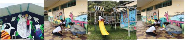 Maestra 1: Es que cuando yo llegué los espacios se veían precarios. Y dije ¡No! Así no quiero que sea mi escuela, no por ser rural tiene que estar en malas condiciones, mis estudiantes merecen habitar un lugar digno. Creí que era posible, le puse unos papeles al piso y comencé a pintar, un amigo grafitero se unió e hicimos el mural de somos una familia de mil colores, en éste los niños querían plasmar su idea de escuela arcoíris porque refleja la diversidad que somos; pintamos juntos, todo lo hago con ellos; fui sensibilizando a la comunidad porque también se trata del cuidado de lo público, de lo que es de todos, así que las familias vinieron a ayudar. ¡A veces, también me desanimo! Porque al profe rural le toca solo, en el sentido de la poca o nula presencia del Estado, de los organismos locales y departamentales, entonces es lo que uno pueda hacer en la medida de las posibilidades que va gestando.