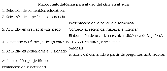 Tomando como referencia las propuestas metodológicas para trabajar el cine en el aula de autores como Ambrós y Breu (2008, 2011), Astudillo et al. (2012), Breu (2010), Escobar y Rodríguez (2017), García (2008), Martínez et al. (2020), Martínez (2016), Marzábal y Arocena (2016) y Sánchez-Torrres et al. (2019), se elabora un marco metodológico para abordar el uso del cine en la formación inicial del profesorado (Tabla 1), en este caso con el fin de trabajar contenidos relacionados con la actual crisis ambiental y la sostenibilidad.