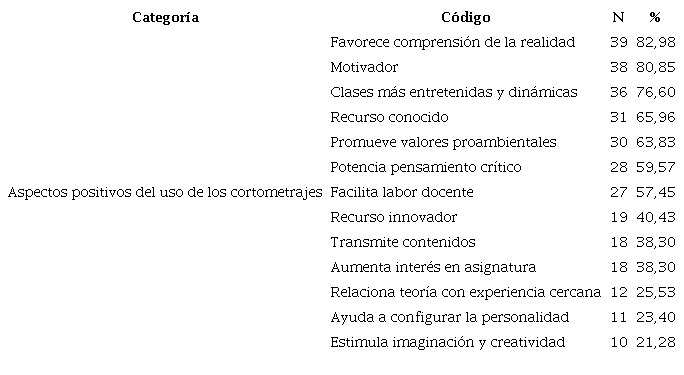 El análisis de contenido de las producciones escritas de los estudiantes permitió, para la primera de las preguntas, establecer una serie de códigos que permitieron identificar aquellos aspectos positivos del uso de cortometrajes animados. Entre los resultados nombrados con más frecuencia destaca el hecho de que, a juicio de los estudiantes, el cortometraje animado favorece la comprensión de la realidad, algo que fue destacado por el 82,98% de los participantes en la actividad. También destacaron que el cine animado resulta motivador (80,85%) y que permite el desarrollo de unas clases más entretenidas y dinámicas (76,60%). El resto de los resultados figuran en la Tabla 3.