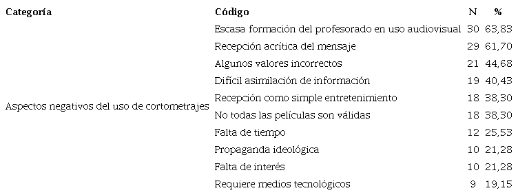 En cuanto a los inconvenientes que puede presentar el uso de cortometrajes animados en el aula de primaria, el análisis de las producciones escritas de los futuros docentes pone de manifiesto como principal obstáculo la escasa formación del profesorado en el uso de lo audiovisual, algo en lo que coincide el 63,83% de los estudiantes que participaron en la actividad. Destaca también, con un 61,70%, la opinión de una posible recepción acrítica de los mensajes audiovisuales, algo que unido a la recepción como un simple entretenimiento (38,30%) puede mermar la calidad de la enseñanza basada en estos medios. Además, también se señala la falta de tiempo (25,23%) y la necesidad de medios tecnológicos adecuados (19,15%) como posibles obstáculos para el uso del cortometraje en el aula. El resto de los resultados quedan resumidos en la Tabla 4.