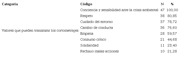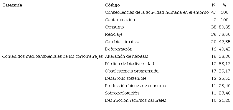 La capacidad para identificar un amplio elenco tanto de contenidos como de valores proambientales parece señalar que los estudiantes, tanto en su formación académica, como en su vida personal han alcanzado cierto nivel de sensibilidad ante la crisis ambiental y son capaces de aplicar sus conocimientos para analizar con cierta profundidad los audiovisuales propuestos.