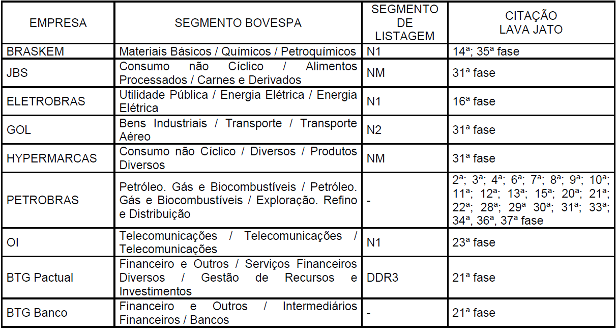 A Figura 2 apresenta as empresas citadas nas investigações no período que abrange da primeira à trigésima sétima fases. Desse quadro, tem-se o conjunto de empresas “citadas” na operação “Lava Jato” e as respectivas fases em que houve a citação. Com base nesses dados, diferenciam-se as empresas citadas das não citadas na Operação Lava Jato.