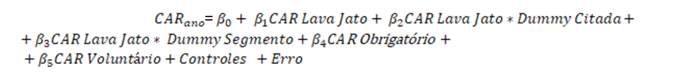 Dessa forma, as variáveis independentes CAR_LavaJato, CAR_Obrigatório e CAR_Voluntário representam em termos consolidados, a soma dos CARs dos respectivos tipos de eventos durante o ano, sempre considerando a janela de 01 (um) dia em torno de cada evento de uma mesma espécie (Lava Jato, obrigatório ou voluntário). Nos casos em que um evento de divulgação voluntária caiu na mesma janela de um evento da Lava Jato, considerou-se somente o evento da “Lava Jato”.O modelo proposto pela equação (1) tem por objetivo verificar se os eventos de divulgação das fases da Java Jato ao longo dos anos de 2014, 2015 e 2016 apresentaram informações que possam explicar os retornos anormais acumulados no ano das ações que compõem o mercado e a reação do mercado para as ações de empresas do mesmo setor das citadas na Lava Jato.