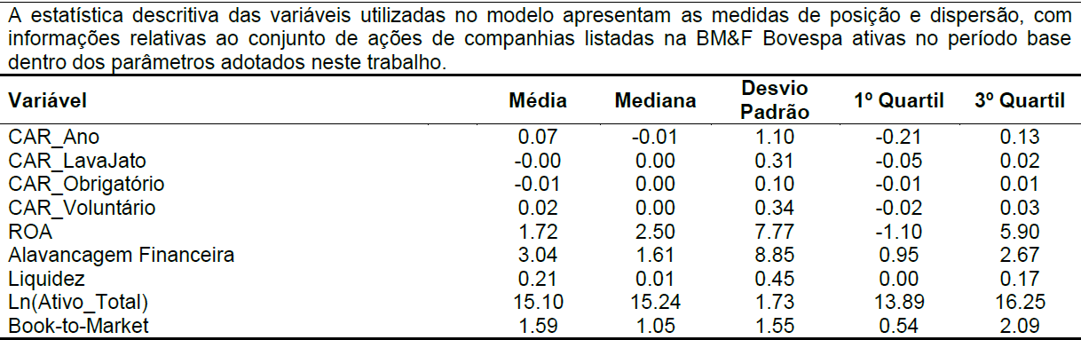 Com base no modelo proposto, as observações para o cálculo do CAR foram consolidadas em ações de diferentes classes e empresas no ano. A base foi inicialmente composta por 371 companhias somando 579 classes de ações, em um total de 453.412 observações diárias, no período base. Para o tratamento dos dados, foram eliminadas as empresas que não apresentavam qualquer retorno diário no período de 365 dias. Ao todo, foram excluídas 152.447 observações, restando 300.965 observações referentes a 298 empresas e 411 ações.