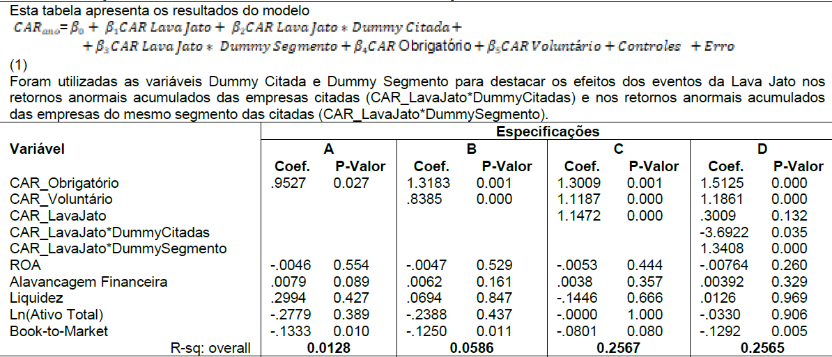 O coeficiente negativo referente à interação CAR_LavaJato*DummyCitadas evidencia o custo gerado pela operação Lava Jato às empresas diretamente envolvidas nos escândalos de corrupção. Tais resultados indicam que a operação reduziu o valor de mercado dessas empresas acima de variações que ocorreram no mercado, o que segue alinhado a Macnab (2003), cujos resultados sugerem que, na presença de corrupção, os retornos sobre os investimentos são mais difíceis de prever. O resultado afetou as decisões sobre os investimentos privados, com consequência negativa sobre o desenvolvimento econômico e sustentável em longo prazo.
