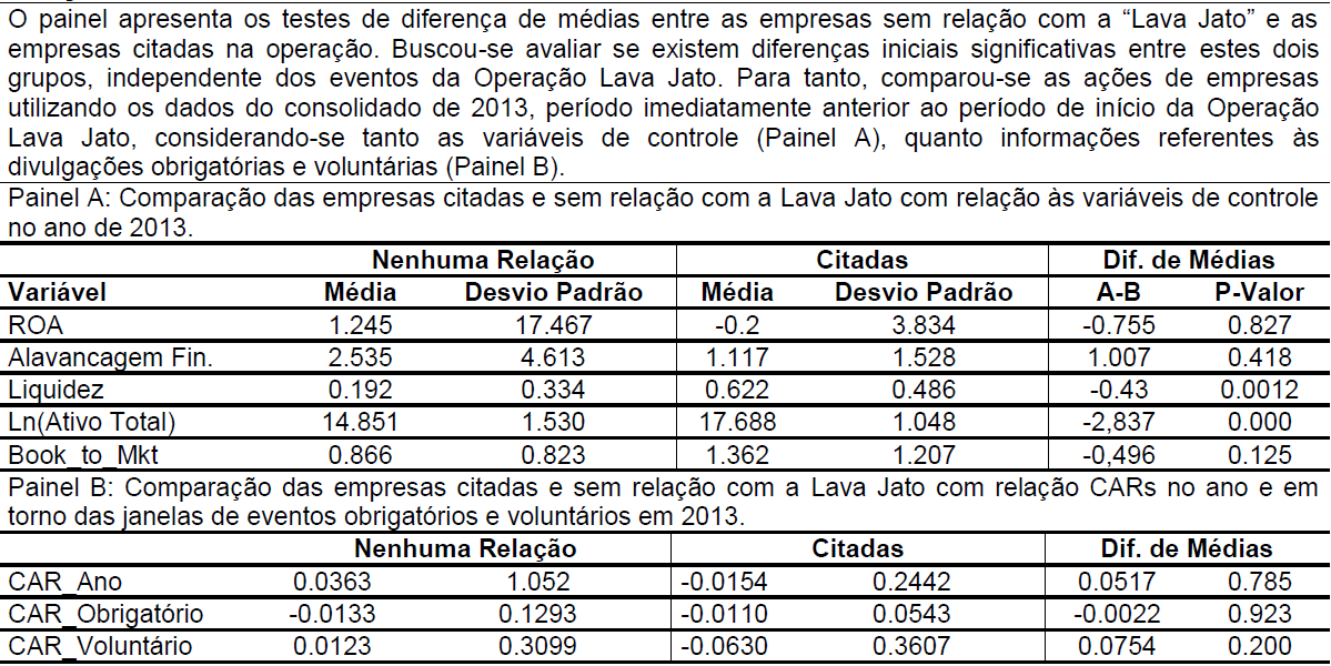 Com o objetivo de verificar se empresas citadas já apresentavam diferenças de retornos em relação a empresas com nenhuma relação com a Lava Jato, mesmo antes do início das operações, realizou-se testes t de diferença de médias que comparam as médias das variáveis de controle e variáveis CAR levando-se em consideração dados de 2013 de empresas citadas na Lava Jato (Citadas) com o grupo de empresas que não foram citadas e não pertencem ao setor das citadas (Nenhuma Relação).