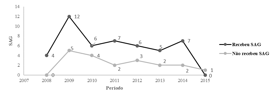 De modo geral, 71,2% das empresas da amostra evidenciaram o recebimento de SAG. Observa-se na Figura 1 que o ápice de recebimento de SAG pelas empresas ocorreu em 2009, com total de 12 benefícios (29,3%). Além disso, é possível observar, na Tabela 4, a partir da publicação do CPC 07 – R1 (2010), que as empresas evidenciaram níveis constantes de recebimento de SAG entre 2010 e 2015, de acordo com a origem dos recursos (federais, estaduais ou municipais).