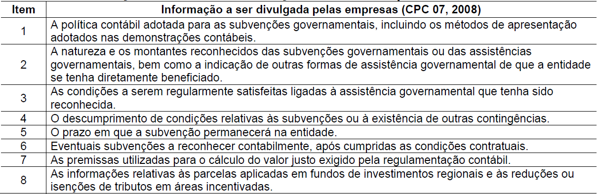 No que diz respeito aos itens que devem ser divulgados nas demonstrações contábeis, o CPC 07 (2008) orientava que as empresas com SAG deveriam divulgar, no mínimo, as seguintes informações: (a) a política contábil e os métodos de apresentação adotados para as SAG; (b) a natureza e a extensão reconhecidas das SAG, bem como a indicação de outras formas de assistência governamental de que a entidade tenha diretamente se beneficiado; (c) condições a serem regularmente satisfeitas ligadas à SAG que tenha sido reconhecida; (d) descumprimento de condições relativas à SAG ou existência de outras contingências; (e) o prazo em que a SAG permanecerá na entidade; (f) eventuais SAG a reconhecer contabilmente, após cumpridas as condições contratuais; (g) premissas utilizadas para o cálculo do valor justo e (h) informações relativas às parcelas aplicadas em fundos de investimentos regionais e às reduções ou isenções de tributos em áreas incentivadas. Com as alterações inseridas pelo CPC 07 – R1 (2010), o quantitativo de itens que devem ser divulgados pelas empresas foi reduzido, disciplinando que apenas as informações apontadas nos itens (a), (b) e (c) devem ser divulgadas.