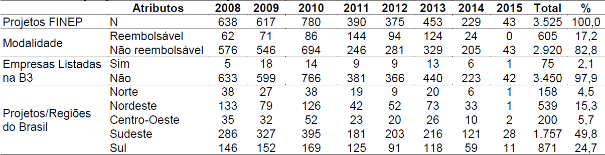 No período de 2008 a 2015, foram enviados ao FINEP 3.930 projetos, dos quais 3.577 receberam recursos. Pode-se verificar na Tabela 2 que o ano com mais projetos financiados pelo FINEP foi o de 2010, com total de 780 projetos. Em segundo lugar ficou o ano de 2008, com 638 projetos. Verifica-se também queda no número de projetos financiados nos três últimos anos. Quanto à modalidade, verificou-se que a maioria dos financiamentos é do tipo sem reembolso, com total de 2.920 projetos sem reembolso e 605 com reembolso.