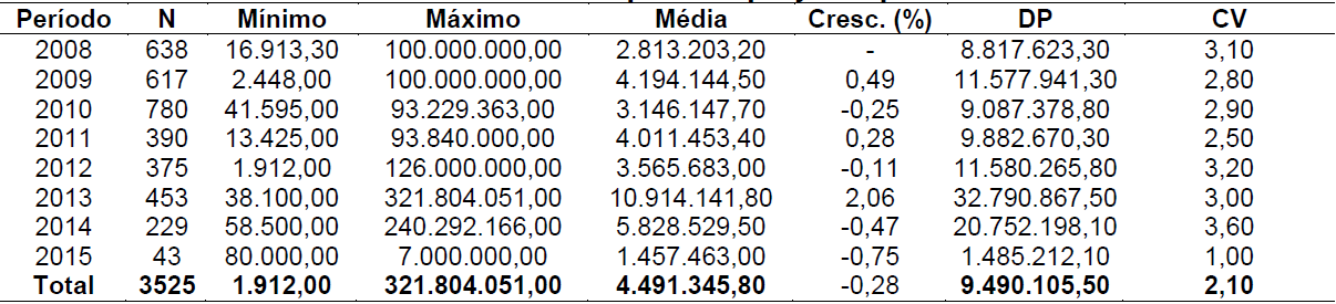 Em continuidade à verificação dos projetos, procedeu-se à análise descritiva dos recursos liberados, no período de 2008 a 2015, observando o valor médio de R$ 4.491.345,80 para financiamento, conforme apresentado na Tabela 3.