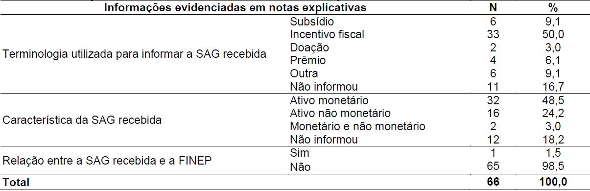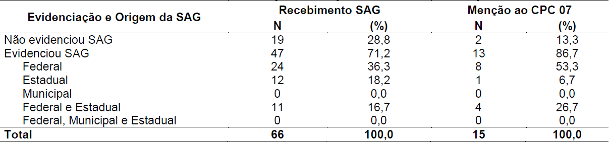 Os resultados mostram que 28,8% das empresas não evidenciaram o recebimento de SAG. Todavia, realizaram menção explícita quanto ao CPC 07. Além disso, é possível observar que, das empresas que receberam SAG, 24 (36,3%) têm origem federal, 12 (18,2%) estadual e nenhuma empresa apresentou origem municipal. Parte representativa dessas subvenções recebidas estão sob a forma de incentivos fiscais. Foi apresentado nas notas explicativas, principalmente, a redução da parcela do Imposto de Renda Pessoa Jurídica [IRPJ], devido ou não.