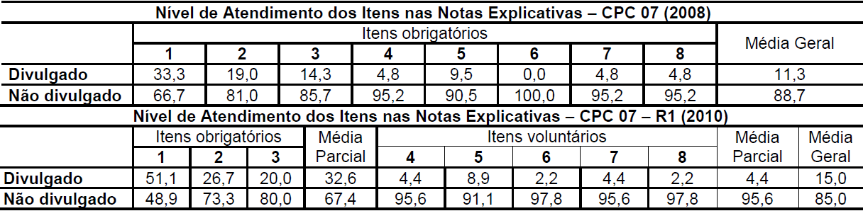 Quanto ao período de 2010 a 2015, a Tabela 7 apresenta que 32,6% das empresas divulgaram os itens obrigatórios e 4,4 % expuseram os itens voluntários. No geral, apenas 15% das empresas da amostra apresentaram os itens obrigatórios e voluntários. Ao se analisar cada item, separadamente, verifica-se que dos três itens obrigatórios do CPC 07 – R1 (2010), somente o item 1 apresentou maior percentual de divulgação (51,1%). Os itens 2 e 3 não foram divulgados pela maioria das empresas, num percentual de divulgação de 73,3% e 80,0%, respectivamente. Quanto aos itens voluntários, a grande parte da amostra não evidenciou as informações referentes a esses itens.