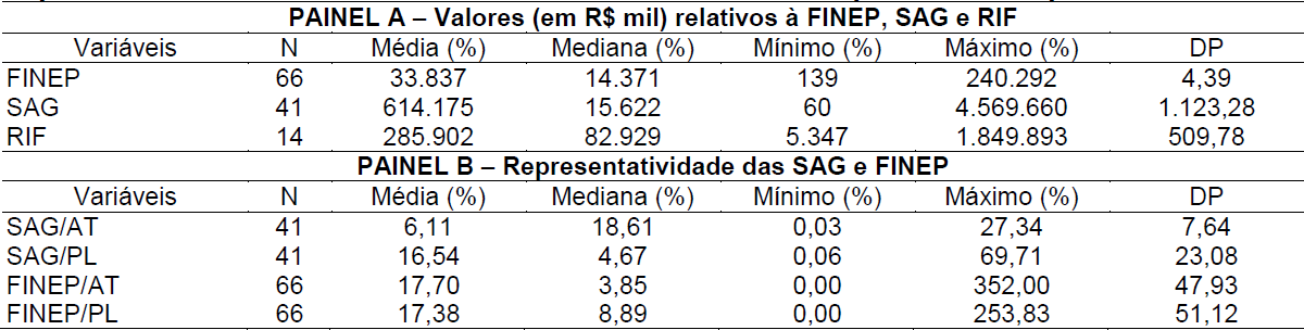 Outros apontamentos referem-se à representatividade dos valores recebidos, pois quando verificada a representação das SAG e dos recursos da FINEP, recebidos com o ativo total e com o patrimônio líquido, a média é de 11,3% e 17,5%, respectivamente. Nessa direção, Loureiro et al. (2011) verificaram considerável participação das SAG no capital próprio das empresas dos setores têxtil e papel e celulose. Essas evidências mostram a relevância dos recursos públicos recebidos pelas empresas e fortalece a necessidade de maior cumprimento às normas contábeis e de fiscalização pelos organismos contábeis.