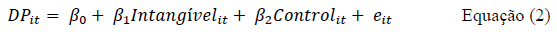 Para facilitar o entendimento, foram elaborados dois modelos gerais para a investigação da relação entre os ativos intangíveis e as previsões dos analistas. No modelo 1, utilizou-se como variável dependente a “acurácia das previsões dos analistas” e as variáveis independentes que representam os intangíveis, apresentadas na Tabela 2 (P&D, Ativos intangíveis e Goodwill), em regressões distintas. Enquanto no modelo 2, por outro lado, utilizou-se a “dispersão das previsões dos analistas” como variável dependente do modelo e, novamente, como variáveis independentes foram utilizados o “P&D”, “Ativos intangíveis” e “Goodwill”.