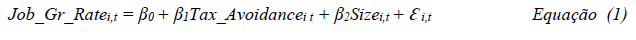 Para medir a variação na criação de emprego das empresas na amostra, usamos a variável Job_Gr_Rate, (número de colaboradores da empresa no ano atual/número de colaboradores no ano anterior) – 1. O número de colaboradores foi coletado do formulário de referência enviado à CVM, usando o software Empresas.NET. O modelo usado para testar a relação entre a taxa de criação de emprego e elisão fiscal ou agressividade fiscal foi a seguinte: