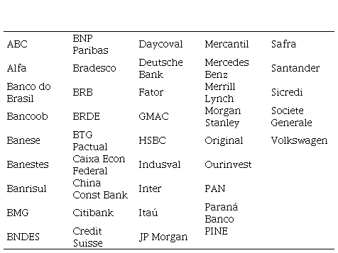 Partindo de consulta ao site de cada instituição financeira e à Central de Demonstrações Financeiras do Sistema Financeiro Nacional [CDSFN], disponível no sítio do Banco Central do Brasil [BCB], foram coletados os dados relativos a todos os bancos que operam no Brasil e que publicaram suas demonstrações financeiras em IFRS, conforme listagem na Tabela 1 com 41 bancos.