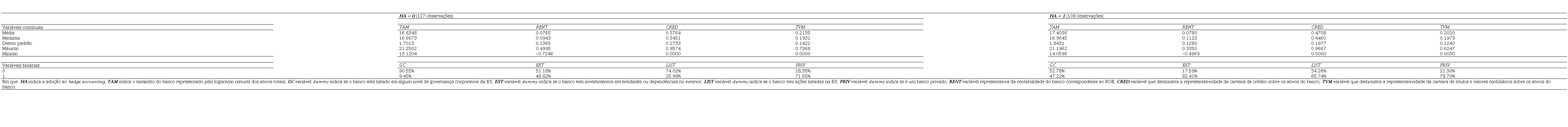 A primeira etapa dos testes empíricos consistiu na apuração e análise das estatísticas descritivas das variáveis do modelo (3.1), segregando as informações relativas às variáveis contínuas e binárias em dois blocos – demonstrações sem (HA=0) e com (HA=1) adoção do hedge accounting. Os resultados das 235 observações banco/ano são apresentados na Tabela 2.