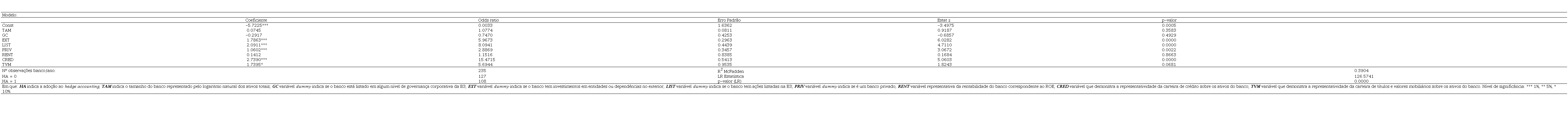 Para a identificação dos determinantes da adoção ao hedge accounting pelos bancos brasileiros foi desenvolvido o modelo de regressão logit (3.1), considerando como variáveis independentes os potenciais fatores explicativos da decisão dos bancos da amostra em utilizar a contabilidade de hedge.