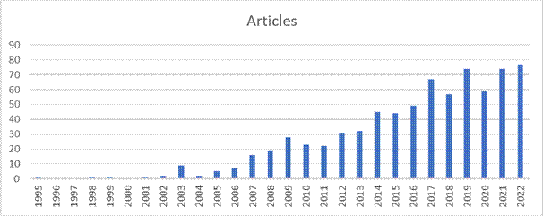 Dá-se início a análise dos dados com a Figura 2, que demostra as pesquisas entre os anos de 1995 e 2022. Conforme demostrado na figura, a primeira pesquisa da base da Scopus é datada de 1995, sendo esta, desenvolvida por Massimo Warglien e publicada no Industrial and Corporate Change com 691 citações no Google Acadêmico e 289 na base de dados da Scopus. A pesquisa é de única autoria, Warglien (1995) investigou a hierarquia de processos organizacionais e a inovação radical e incremental nas organizações, explorando como as interações entre dinâmicas utilizadas pela organização moldam a evolução das empresas.