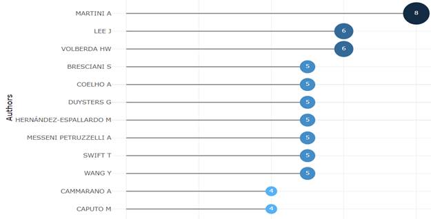A Figura 3 apresenta os doze autores mais relevantes que possuem publicações envolvendo o tema Innovation Exploitation, InnovationExploration, segundo a base de dados da pesquisa. Martini se destaca com 8 publicações a respeito do tema inovação organizacional, Antonella Martini é professora da Universidade de Pisa na Itália, e possui sua linha de pesquisa voltada para gestão organizacional e inovação.