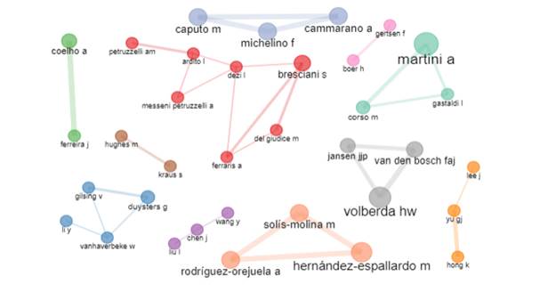 Quanto à rede de colaboração entre autores a Figura 5 apresenta as principais relações entre os pesquisadores de Innovation Exploitation, Innovation Exploration ou ainda Innovation Ambidexterity. De acordo com a amostra de dados da pesquisa, as 3 redes mais importantes são em primeiro os pesquisadores italianos Michelino, Caputo e Cammarano com 6 artigos. A pesquisa de maior destaque dos autores possui 118 citações é “Inovação Aberta Inbound e Outbound: Organização e Performances”, publicada no Journal of Technology Management & Amp, em 2014.