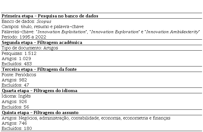 Os termos utilizados para a seleção inicial desta pesquisa foram "Innovation Exploitation" "Innovation Exploration" e "Innovation Ambidexterity" no campo de busca por Título, Resumo e Palavras-chave, sendo que o período de busca foi de 1995, ano em que o primeiro artigo sobre "InnovationExploitation", "InnovationExploration" e "InnovationAmbidexterity" foi publicado na plataforma Scopus,a 2022. A pesquisa na base da Scopus resultou em 1.512 trabalhos.