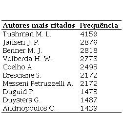 A próxima Tabela apresenta os autores mais citados, sendo Tushman com 4159 citações, quase o dobro de Jansen, que possui 2876 citações, seguido de Benner e Volberda com 2818 e 2778, respectivamente. O professor Michael L. Tushman é um teórico organizacional, consultor da área de gestão de empresas e professor de administração de empresas na Harvard Business School, e suas principais pesquisas são desenvolvidas na área da gestão como inovação disruptiva, ambientes organizacionais e evolução organizacional. Tushman desenvolveu muitas pesquisas envolvendo os processos internos da organização, entretanto suas últimas pesquisas estão mais voltadas para o comportamento dos gestores. Como pesquisador, o professor possui 105.643 citações no Google Acadêmico.