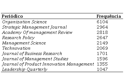 Technological Forecasting and Social Change se destaca por publicar pesquisas na qual a metodologia e a prática de previsão tecnológica em organizações geram estudos de futuro, como ferramentas de planejamento se inter-relacionam a fatores sociais e ambientais tecnológicos. A Tabela 4 demonstra os periódicos que possuem maior relevância por seu número de citações, com destaque para Organization Science, que possui mais que o dobro de citações que os outros periódicos - 6.104 citações. Os periódicos Strategic Management Journal e Academy Of management Review possuem 2.964 e 2.818 citações, respectivamente.