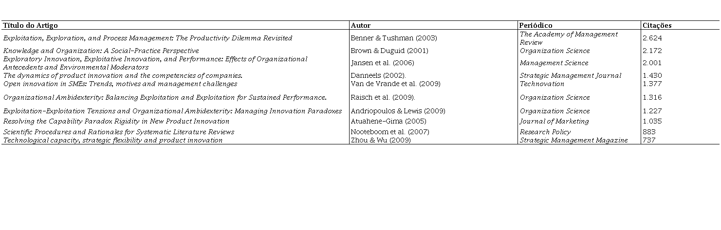 A Tabela 5 apresenta os 10 artigos mais relevantes da amostra desta pesquisa, contendo na tabela: título do artigo, autor, periódico e quantidade de citações de acordo com a base de dados da Scopus. A pesquisa de Benner e Tushman (2003) intitulada “Exploitation, Exploration, and Process Management: The Productivity Dilemma Revisited” possui maior número de citações, sendo: 2.624 citações na base de dados da Scopus e 6.125 citações no Google Acadêmico. Os autores abordaram uma visão contingencial da influência do gerenciamento de processos na inovação e na adaptação dos processos organizacionais (Benner & Tushman, 2003).
