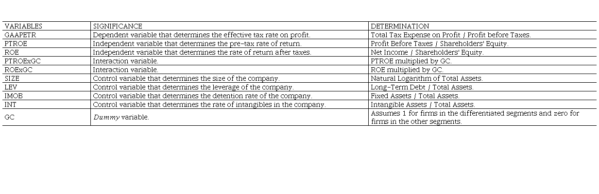 The GC variable is a moderator dummy variable that will assume a value equal to one for the differentiated Corporate Governance segments of the [B]3 and zero for the others (Prado et al., 2014). A negative relationship between the dependent variable GAAPETR and the interaction between PTROE and GC (PTROExGC) suggests that firms in the differentiated Corporate Governance segments of [B]3 have lower implicit taxes than the other segments. On the other hand, a positive relationship between the dependent variable GAAPETR and the interaction between PTROE and GC (PTROExGC) suggests that firms in the differentiated Corporate Governance segments of [B]3 have higher implicit taxes than the other segments. A negative relationship between the dependent variable GAAPETR and the interaction between ROE and GC (ROExGC) suggests that firms in the differentiated Corporate Governance segments of [B]3 can retain the benefits of using tax incentives. On the other hand, a positive relationship between the dependent variable GAAPETR and the interaction between ROE and CG (ROExGC) suggests that companies in the differentiated Corporate Governance segments of [B]3 are unable to retain the benefits obtained from the use of tax incentives (Vieira & Faia, 2018).