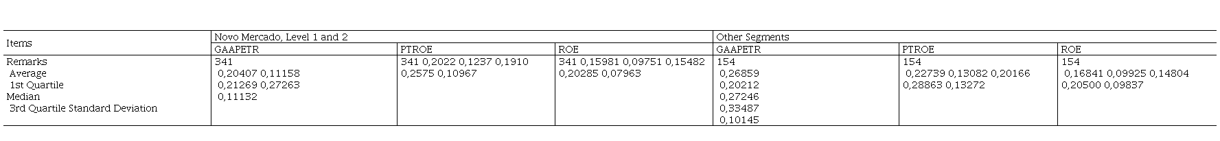 Analyzing the results of the descriptive statistics, it is observed that for taxes on income (GAAPETR) the average explicit tax rate of the companies in the differentiated Corporate Governance segments is lower than the average effective tax rate of the other Corporate Governance segments. In addition, it is also observed that in the first quartile, the median, and the third quartile, the average explicit tax rates of firms in the differentiated Corporate Governance segments are lower than the average explicit tax rates of the other segments, suggesting that across the distribution firms in the differentiated segments are using tax incentives more intensively than firms in the different Corporate Governance segments.