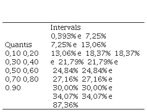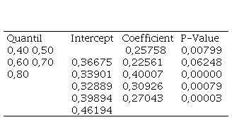 The following table presents the results of the quantile regression concerning the tests performed about the interaction between the rate of return after taxes (ROE) and corporate governance (CG), which assumes a value equal to 1 for the companies in the differentiated segments and zero for the companies in the other segments. It should be noted that only the results of the quantiles in which the interactions presented statistical significance are shown.