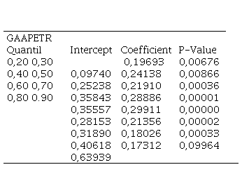 The following table presents the quantile regression results concerning the tests performed for the interaction between pre-tax rate of return (PTROE) and corporate governance (CG), which assumes a value equal to 1 for companies in the differentiated segments and zero for companies in the other segments. Therefore, only the results of the quantiles in which the interactions were statistically significant are presented.