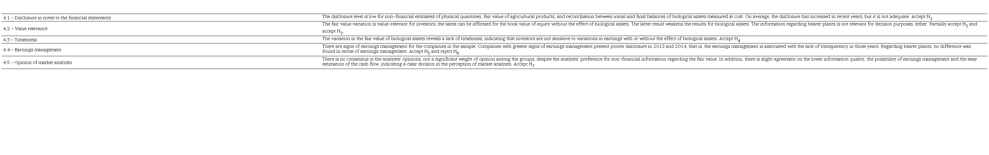 The results for these five sections permit a partial acceptance of the research hypothesis, that is, that IAS 41 makes a reasonable contribution to the production of high-quality information in Brazilian companies’ financial statements. Overall, improvements can be observed in the disclosure of information on biological assets in the notes to the financial statements, offering relevant information for decision purposes, despite evidence that the financial information is not timely, and that there is earnings management associated with poor disclosure. Finally, analysts point to the need to improve certain disclosure aspects, which implies that more time must be spent discussing IAS 41.