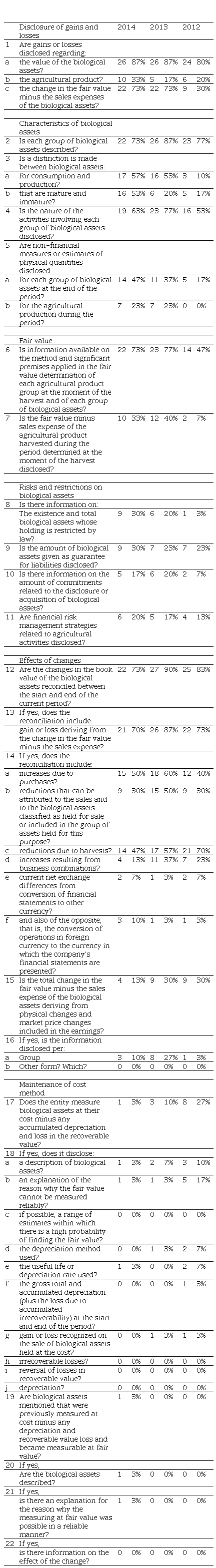 First, we analyzed the compliance of the notes to the financial statements with the requirements of IAS 41. We created a checklist based on the 22 disclosure items of IAS 41, and then we analyzed the notes to the financial statements for the period 2012-2014 for the companies in the sample. If the required information was present, a score of one was given, and on the contrary, zero. In general, the items checked were the disclosure of gains and losses, characteristics of the biological assets, fair value, risks and restrictions on biological assets, effects of changes, and maintenance of cost method. Thus, we reached evidence to analyze the level of disclosure of these companies with biological assets.