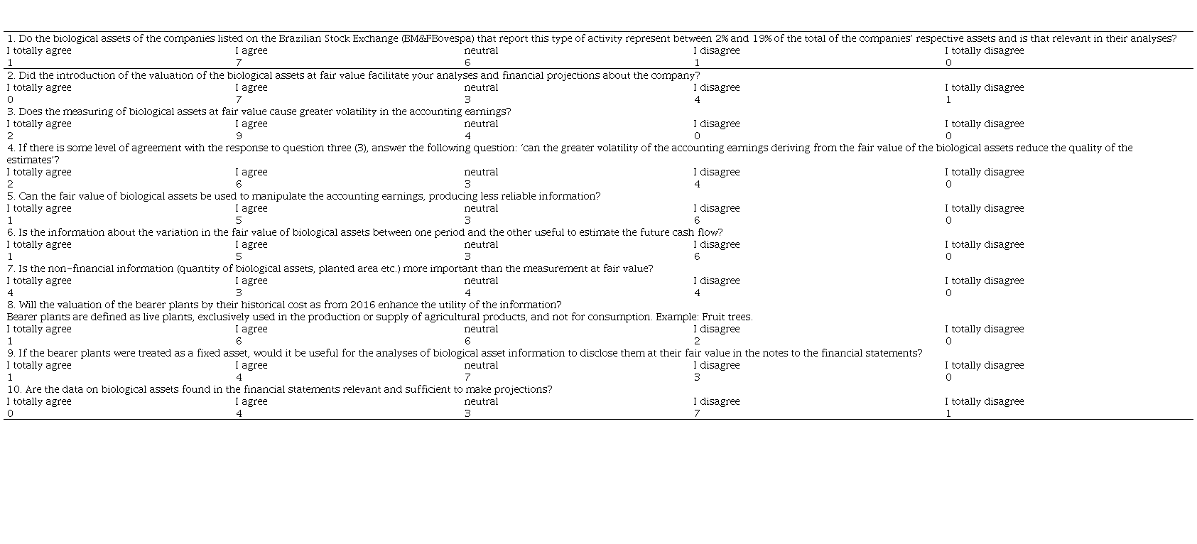 In short, for a considerable number of the respondents, the answers showed general agreement. Hence, these professionals were familiar with the relevance of biological assets, with their measurement at fair value, with the variation in the value between one period and another, with the impact on asset volatility and with the revised treatment of bearer plants.