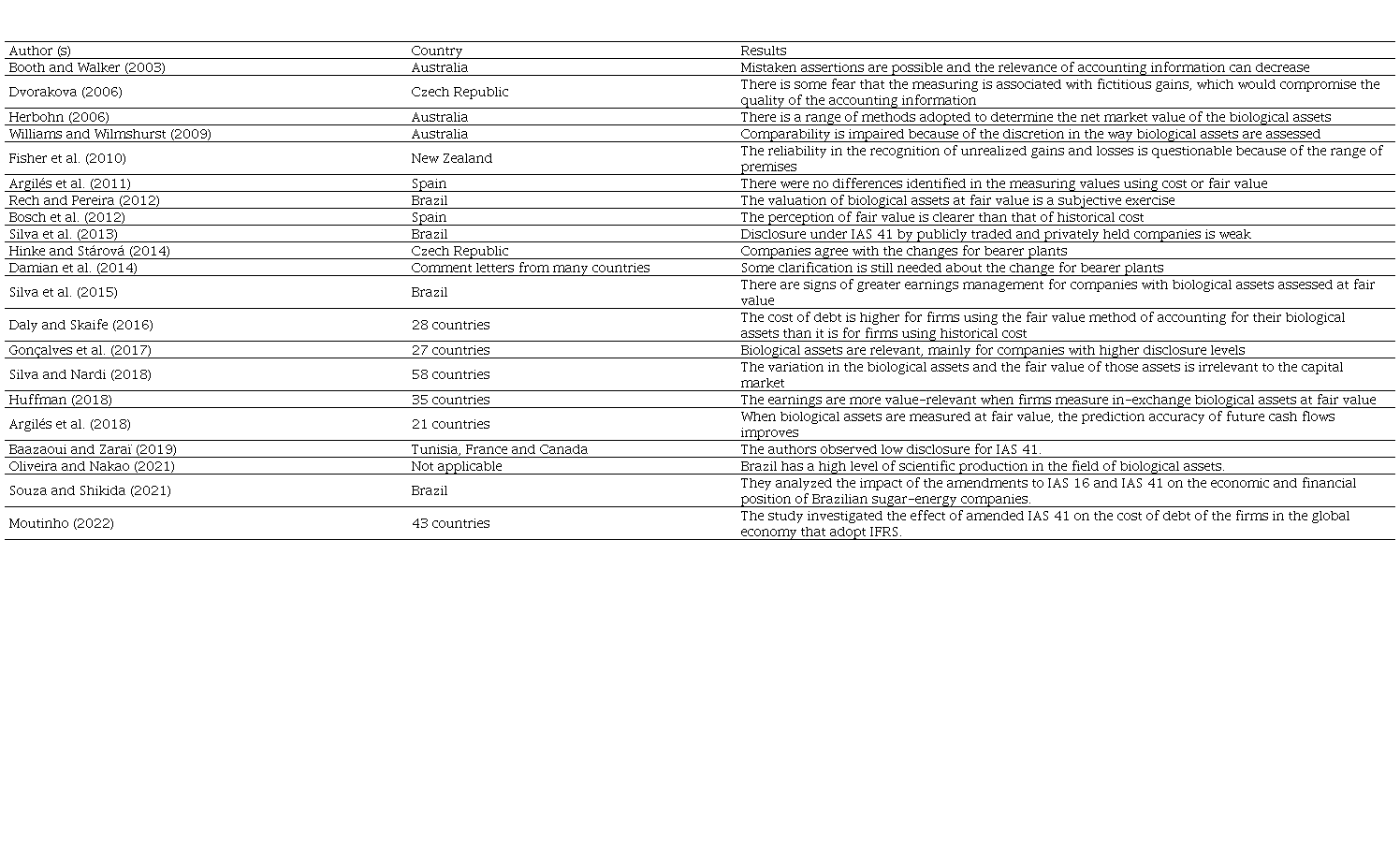 In that sense, the studies by Fisher et al. (2010), Argilés et al. (2011), Rech and Pereira (2012) and He et al. (2018) alert us to the subjectivity and the possibility of earnings management in the application of IAS 41. These and other studies have explored the financial reports, based on the change in the measuring base from the historical cost to the fair value. Some of these studies are displayed in table 1.